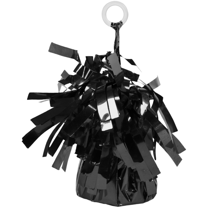 Dit zwarte ballongewicht houdt je heliumballonnen stevig op hun plek en geeft je decoratie een moderne, chique uitstraling. De glanzende metallic franjes zorgen voor een luxe effect, waardoor het gewicht ook zonder ballonnen al een stijlvolle toevoeging is aan je feesttafel.