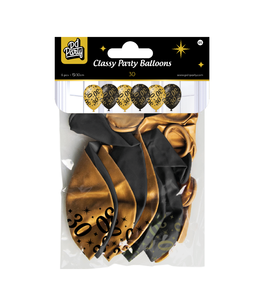 Verpakking van 6 latex ballonnen met het getal 30 en sterretjes als opdruk. In de kleuren goud en zwart, voor een classy uitstraling. Geschikt voor lucht en helium.