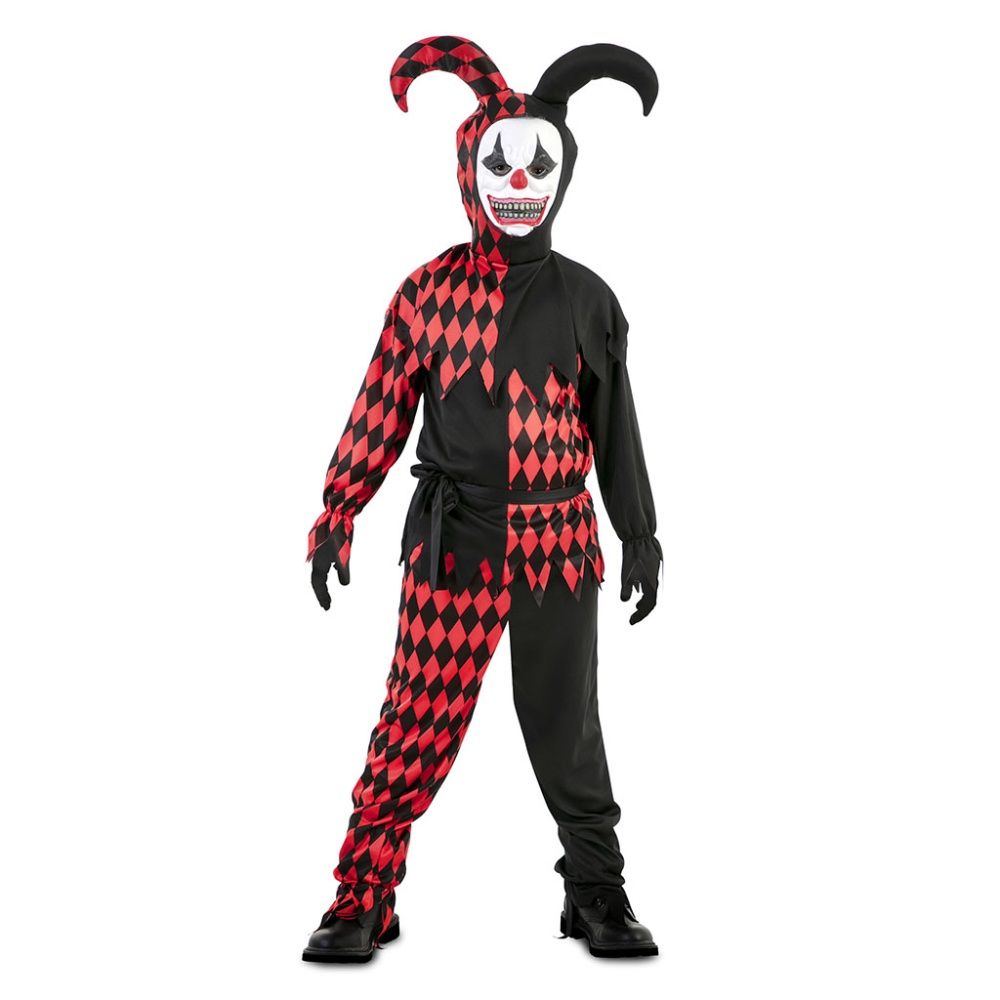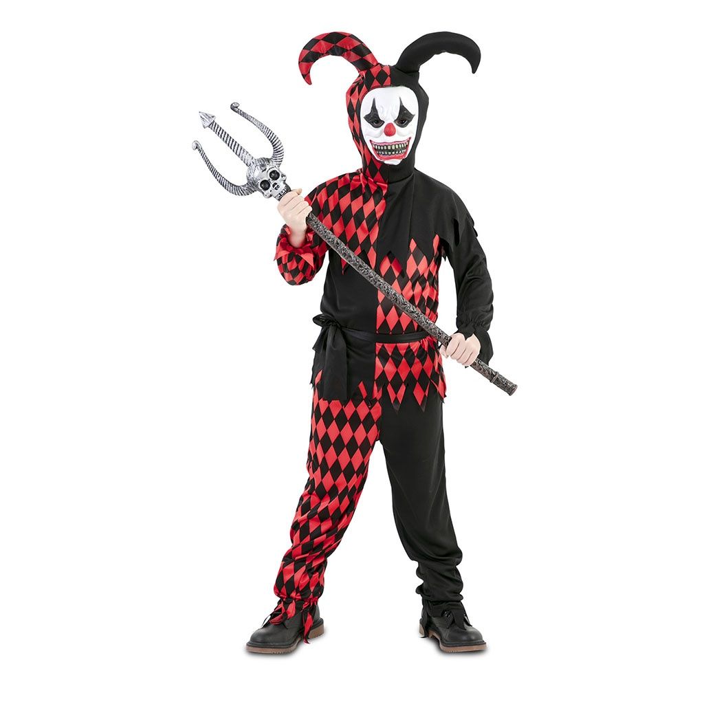 Laat je kind de show stelen met dit duivelse nar kostuum voor jongens. Het kostuum bestaat uit een broek, t-shirt, capuchon met enge details, een masker en een riem. Perfect voor Halloween, carnaval of een griezelfeest op school.