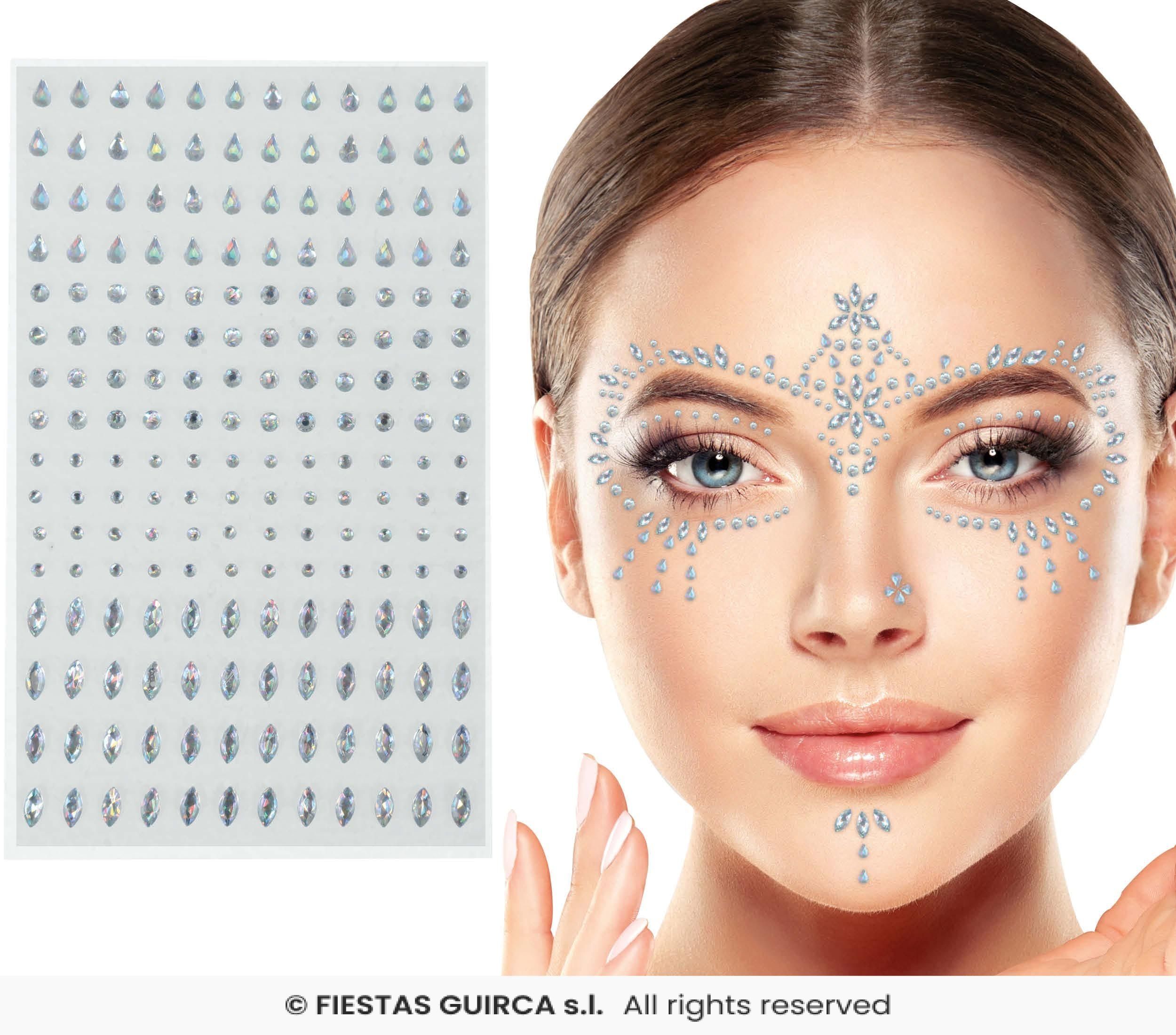 Losse plaksteentjes voor op het gezicht, om zelf een design mee te maken. De steentjes hebben een meerkleurige gloed.