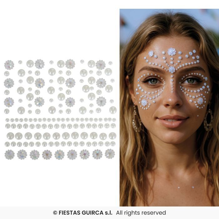 De combinatie van glinsterende steentjes en parels zorgt voor een stijlvolle en trendy uitstraling. De face jewels zijn eenvoudig aan te brengen op een schone, droge huid en blijven goed zitten tijdens het feest. Geschikt voor zowel volwassenen als tieners.