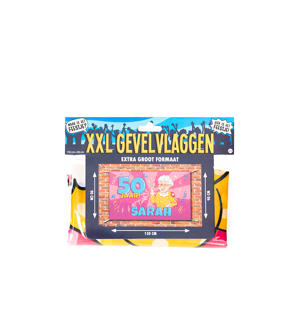 Grote gevelvlag van 90cm x 150cm met cartoon van Sarah en tekst: "50 Jaar! Sarah"