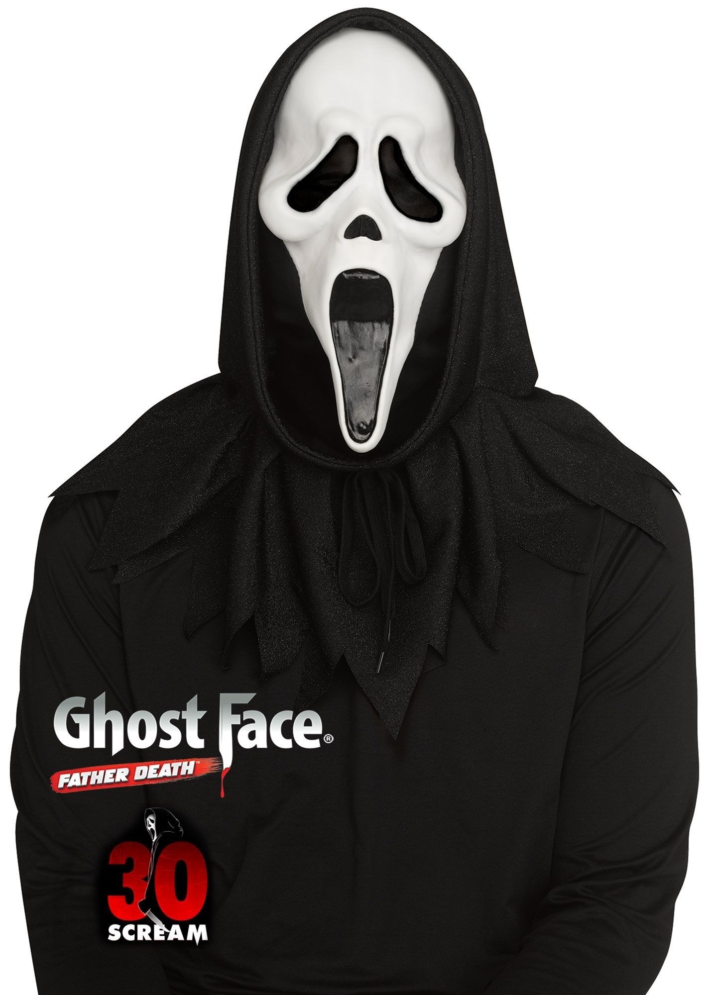 Het masker wordt geleverd met een tweedelige kap en een binnenkap met bevestigd masker. Dankzij de handige klittenbandsluitingen zijn de onderdelen eenvoudig te verbinden en blijft het masker comfortabel zitten. De glow-in-the-dark details zorgen ervoor dat je ook in het donker goed zichtbaar bent, terwijl de subtiele vanillegeur een typisch kenmerk is van het originele Ghost Face® masker.