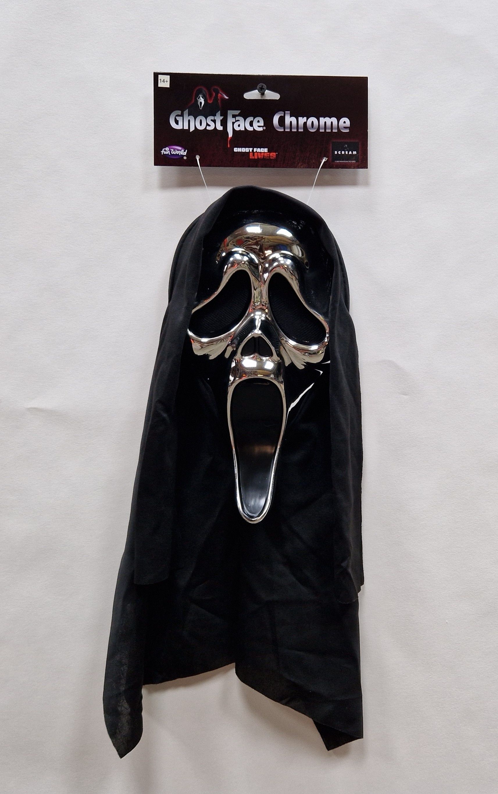 Ghost Face® is een van de meest herkenbare figuren uit de horrorfilmgeschiedenis. Bekend om zijn kenmerkende masker en zwarte kap, geïnspireerd door horroriconen zoals Michael Myers, Freddy Krueger en Jason Voorhees. Met deze zilver chrome uitvoering voeg je een stijlvol en modern accent toe aan je griezeloutfit. Perfect voor fans, cosplayers en verzamelaars die iets unieks zoeken.