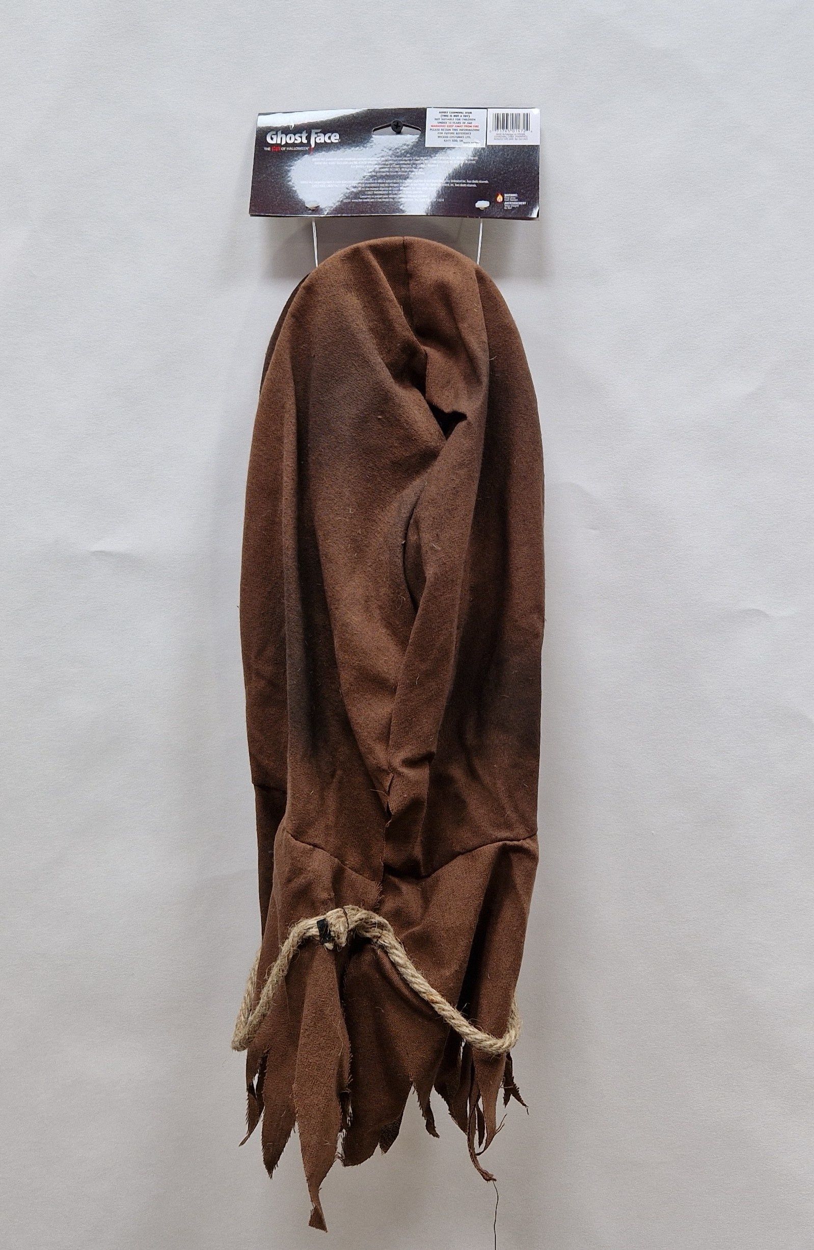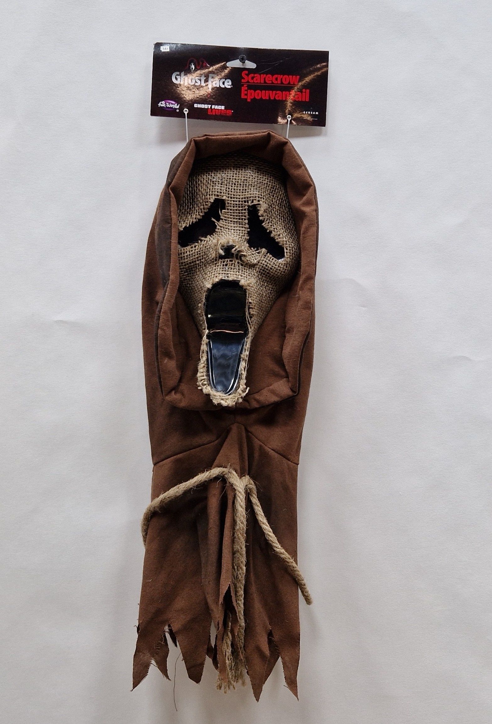 Geef je Halloweenoutfit een angstaanjagende twist met het Ghost Face® Scarecrow masker! Deze unieke variant van het beroemde Scream-masker heeft een verweerde, jute-achtige look, alsof hij zo uit een verlaten maïsveld komt. Oorspronkelijk bedacht als concept voor Scream 4 en bekend geworden in de populaire horrorgame Dead by Daylight, is dit masker een must-have voor elke horror- en gamefan.