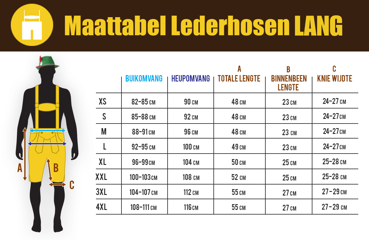- LET OP: Lederhosen zitten hoger dan reguliere jeans!! Gebruik dus de maattabel!