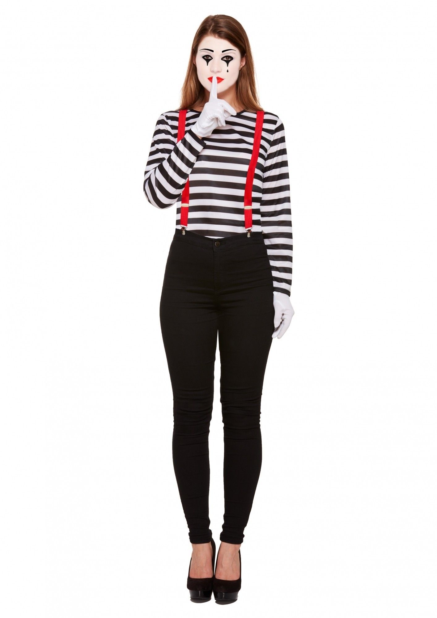 Met dit mimespeler shirt dames heb jij een hilarische en fantastische avond! Je hoeft geen mens te woord te staan en alles mag (moet!) in uitbeelding. Ben jij hier voor gemaakt?! Mimespelers zijn performers die gebruikmaken van gebarentaal, expressie en mimiek om verhalen en emoties te vertellen. Ze gebruiken geen woorden om hun verhaal te vertellen en soms ook geen decors. In plaats daarvan gebruiken ze wat wordt beschouwd als de 'taal van het lichaam' om hun verhalen te vertellen. Mimespelers kunnen worden ingehuurd voor shows en optredens, maar er zijn ook veel mimespelers die als huiskunstenaar werken, die workshops en lessen geven. Stap terug in het traditionele circus gevoel en ga verkleed als mimespeler! Met dit mimespeler shirt dames ervaar je de kunst van dit vak en nooit meer last van schorre stemmen. Ideaal! Maak je straat theater mime outfit compleet met een baret, schmink en witte handschoentjes. Durf je de strijd niet alleen aan of heb je af en toe wat extra lichaamstaal nodig? We hebben naast het mimespeler vrouwen shirt ook een mimespeler shirt voor heren!