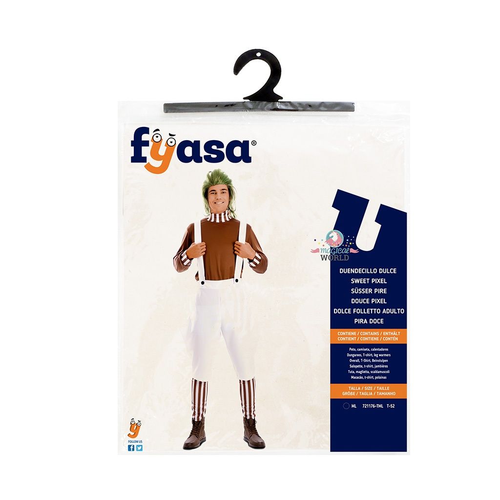 Met dit Oempa Loempa kostuum waan je je direct in de magische chocoladefabriek van Willy Wonka! De bruine trui met witte broek, bretellen en gestreepte details zorgt voor de iconische look van de bekende fabriekshulpjes. Perfect voor themafeesten, carnaval of een filmfeestje met vrienden.
