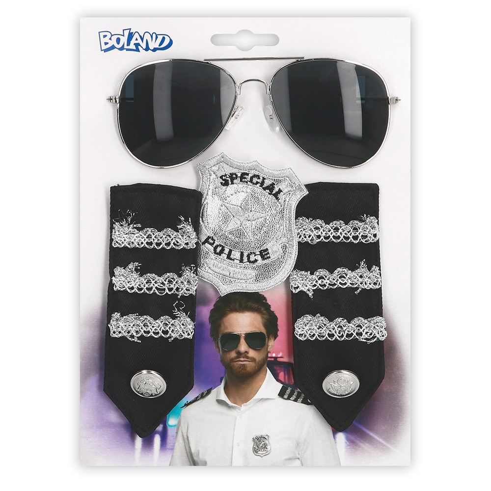 - De Politie set bestaat uit een Politiebril, epauletten en embleem