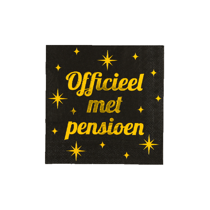 Geef jouw pensioenfeest een luxe en feestelijke uitstraling met deze prachtige Servetten Classy Pensioen! De zwarte achtergrond in combinatie met goudkleurige sterren en de elegante tekst Officieel met pensioen zorgt voor een chique en feestelijke sfeer aan iedere tafel.