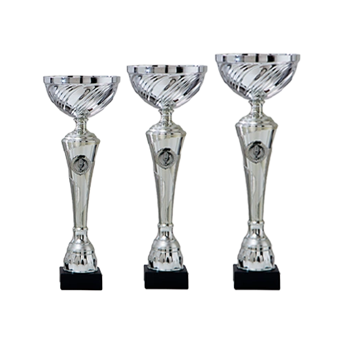 - Zilveren beker met open bovenkant en smal gestroomlijnd design. Met ruimte voor medaille label. Verschillende maten verkrijgbaar. Op zwarte voet.