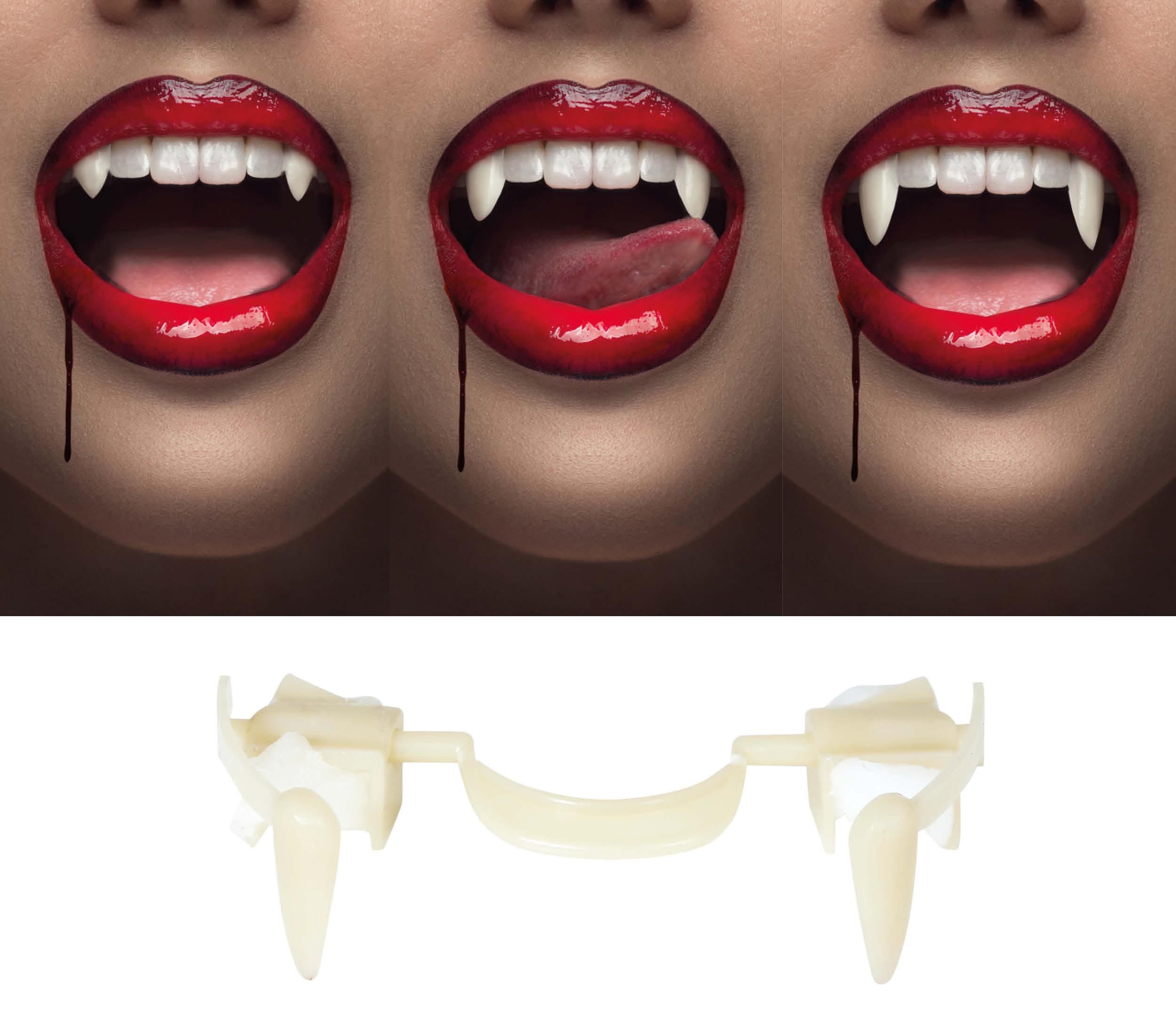 - Plaats de vampiertanden over je eigen hoektanden en klap ze uit voor effect.