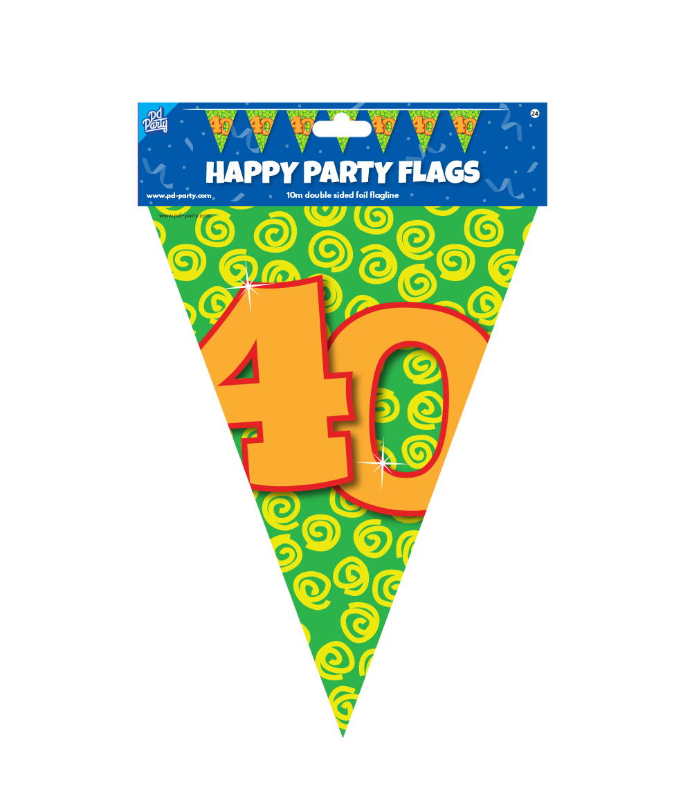Met Vlaggenlijn 40 jaar 10M hangt de feeststemming meteen in de lucht. Snel op te hangen en perfect voor verjaardagen, themafeesten of kantoorborrels.