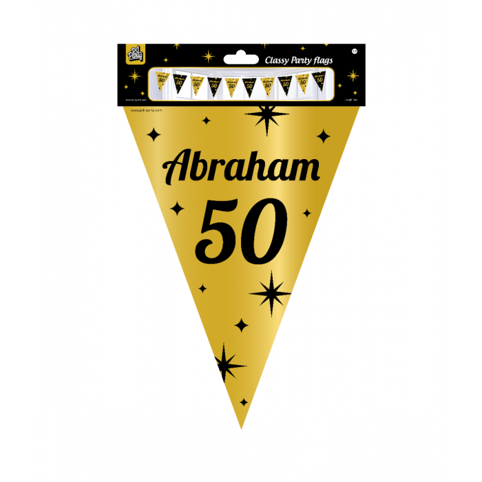 - Design: afwisselend gouden en zwarte vlaggetjes met ‘Abraham 50’
