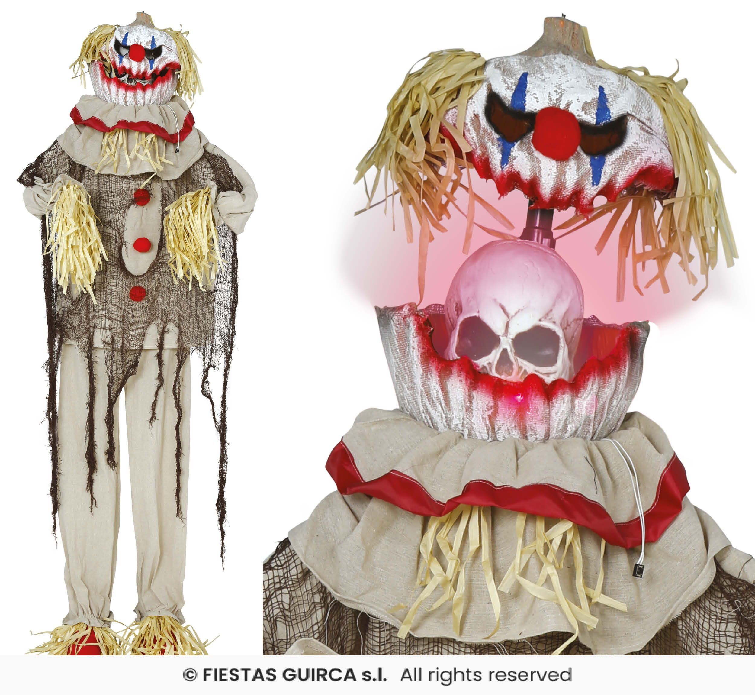 Maak je tuin of entree doodeng met deze horror vogelverschrikker. Op het eerste gezicht lijkt het een enge clown-achtige verschijning, maar zodra hij wordt geactiveerd, springt er een schedel uit zijn lichaam met fel oplichtend rood licht. Het onverwachte schrikeffect wordt versterkt door griezelige geluiden – perfect om bezoekers de stuipen op het lijf te jagen.