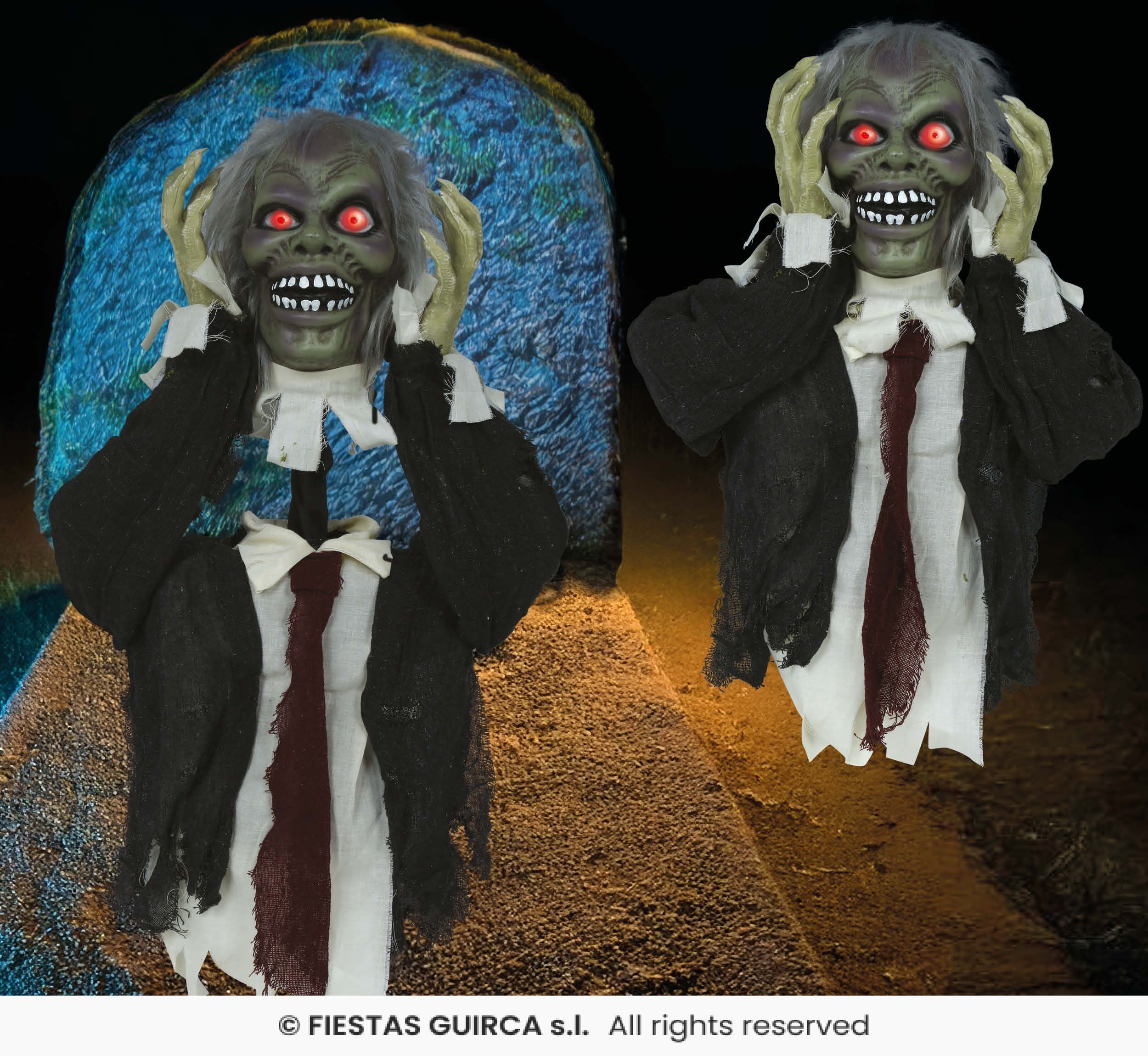 - Realistische zombie-look met scheve tanden en enge grijns.