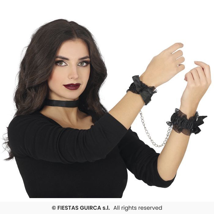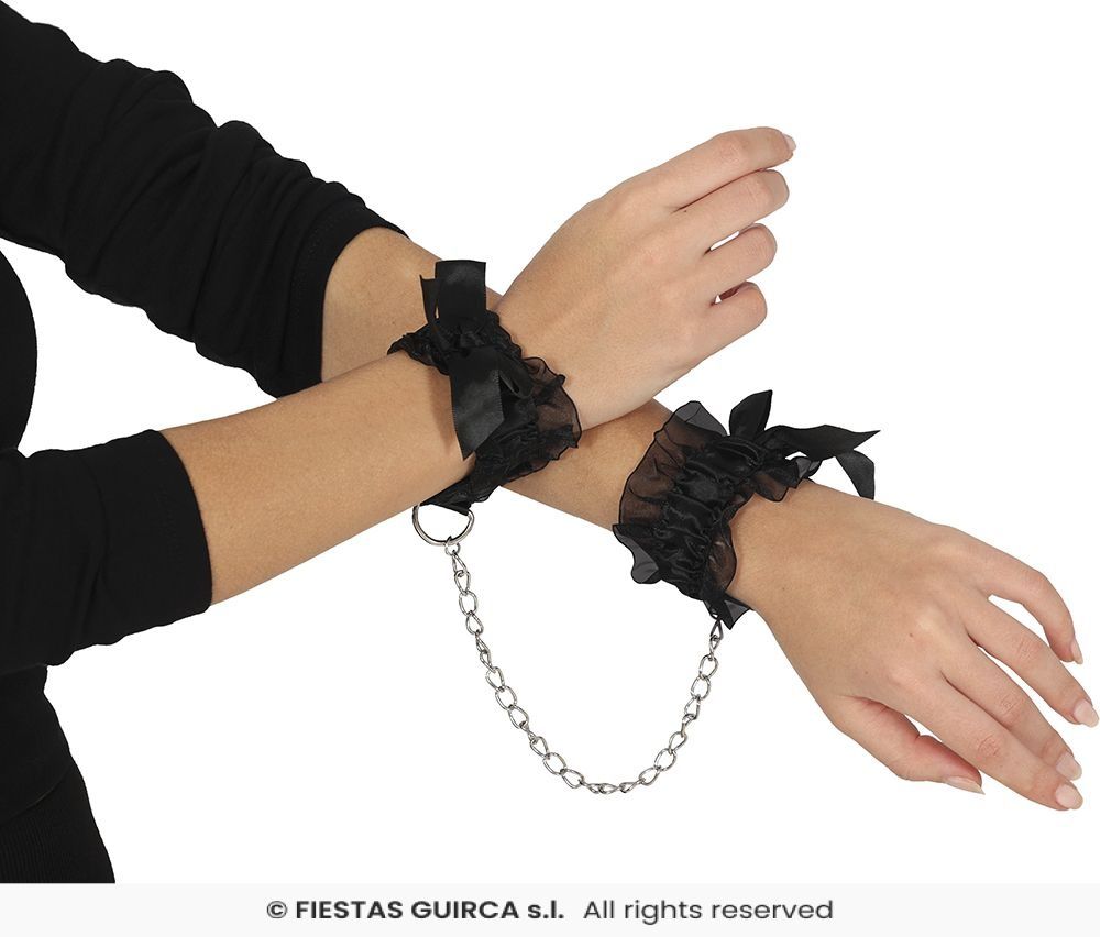 Maak je kostuum compleet met deze stijlvolle zwarte veter handboeien. De manchetjes zijn afgewerkt met zachte ruches en satijnlint en worden verbonden door een lichte metalen ketting. Perfect als dramatisch accessoire bij gothic, heksen of gevangenis- en politie-outfits tijdens Halloween en themafeesten.